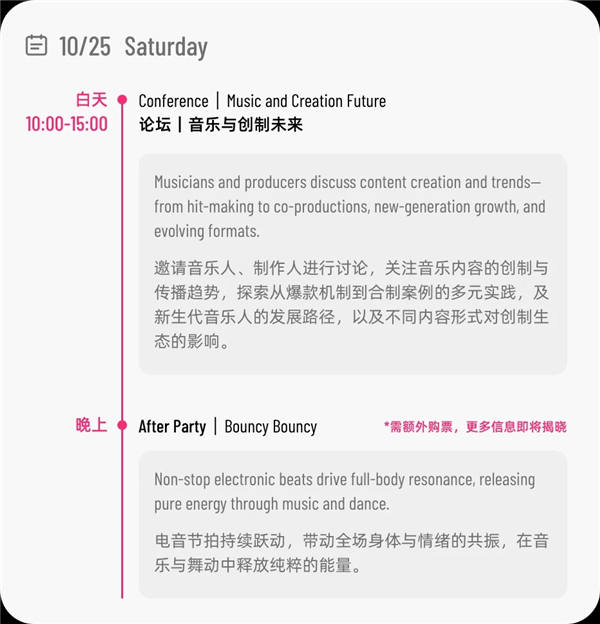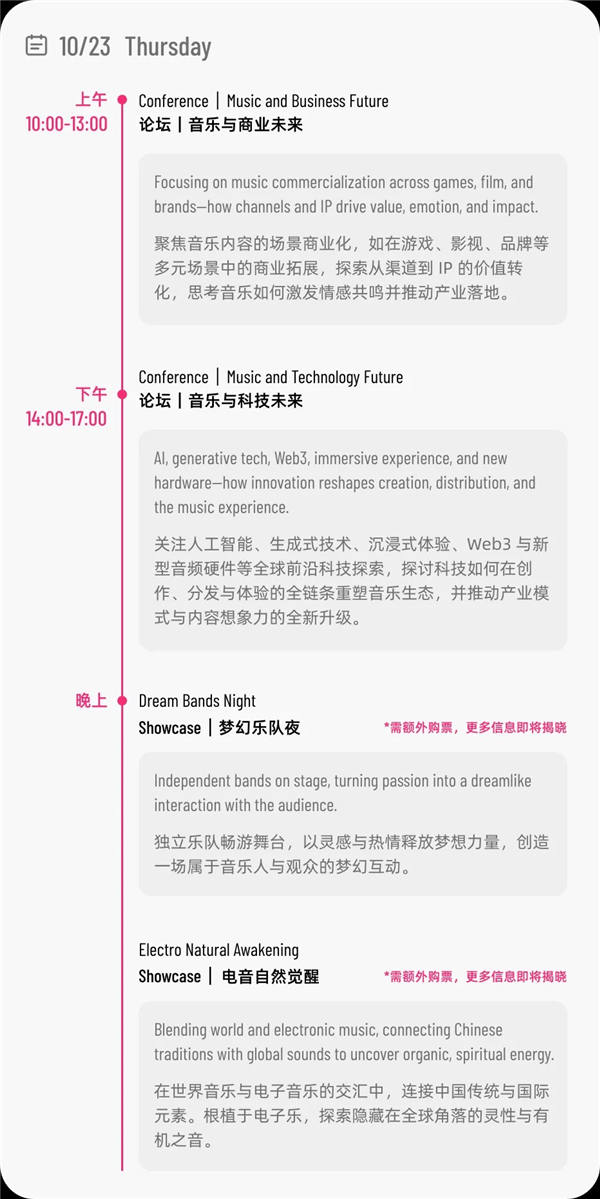 10 月 22 日至 25 日,Music China 携手 IMX 在上海新国际博览中心 N3 馆,将呈现产业论坛、IMXUP、未来展区、商业触点、全球发布及 Showcase6 大活动板块,汇聚来自全球不同国家地区、不同领域的过百位行业先锋,展开近 20 场深度论坛,推动音乐产业的全球协同进化。