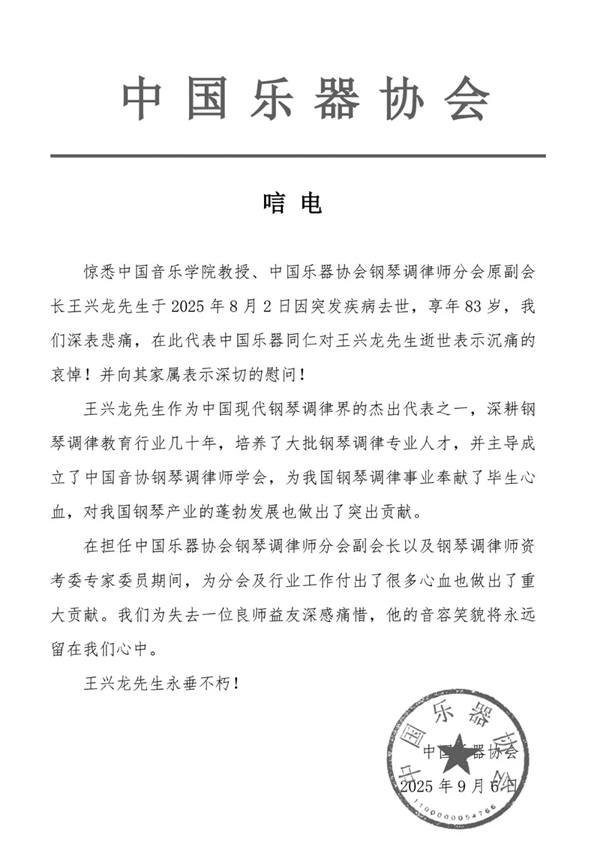 唁电-中国乐器协会