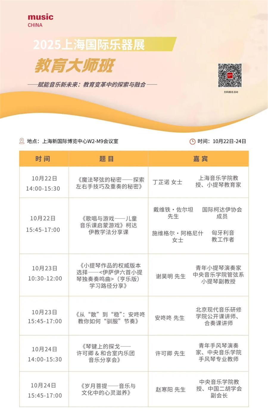 上海国际乐器展在二十余年的发展中,不仅持续构建全球乐器行业的高效交流平台,更始终积极响应国家美育号召,致力于推动全民音乐素养的提升。面对乐器教育与市场生态的深刻变革——线上线下融合教学模式的普及、AI技术对传统音乐学习的重构,以及社会美育需求日益多元化的新趋势,2025教育大师班活动再度汇聚海内外权威专家,旨在为音乐教育者、演奏者及爱好者提供前沿而实用的成长课堂。