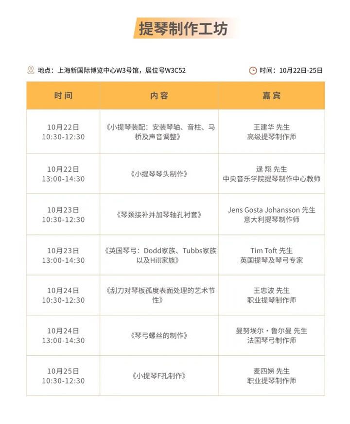 今年提琴制作工坊将带领观众深入每一道工序的幕后,解读一件乐器从木材演变为艺术的生命历程。无论是英国传世琴弓的流派赏析、琴轴衬套的加固技艺,还是琴弓螺丝的手工制作与音柱调试的微妙把握,每一场演示皆是一次与匠心零距离的对话。我们不仅展示精湛技艺,更致力于推动跨文化工艺交流,欢迎每一位音乐爱好者、制琴师与收藏家来到这里,共同聆听、探讨、体验,感受提琴制作艺术的无限魅力。