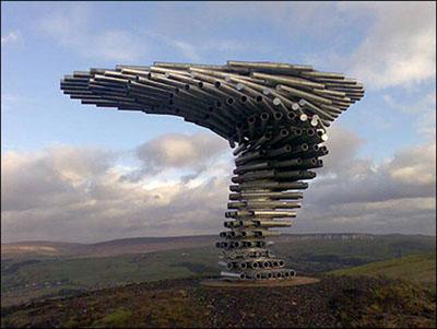 树形乐器——在英格兰兰开夏郡贫瘠的山顶之上矗立着这个极不寻常的音乐雕塑。由建筑师迈克(Mike Tonkin)和安娜·刘(Anna Liu)设计的这款“树”乐器由一系列的管子堆放在一起形成螺旋状。当风在吹,迷人的音调回荡在山坡上。