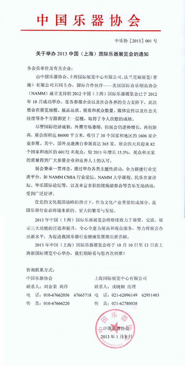 关于举办2013中国(上海)国际乐器展览会的通知-中国乐器协会