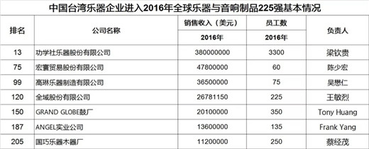 2016年列入225强榜单的中国公司共42家,其中香港3家,中国台湾7家,中国大陆入围公司32家,广州珠江、北京星海、森鹤乐器、宁波海伦、吟飞电子、天津津宝、河北金音、深圳蔚科、广州红棉、泰兴凤灵等中国乐器公司列入榜单。