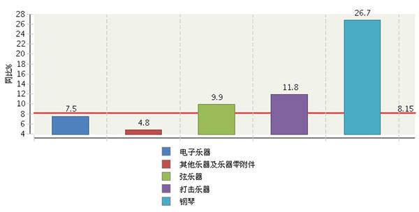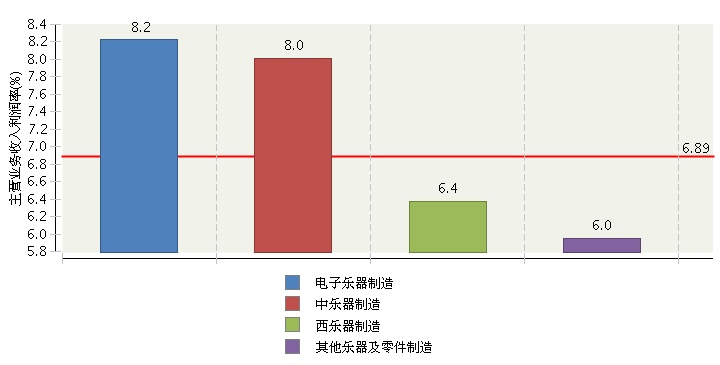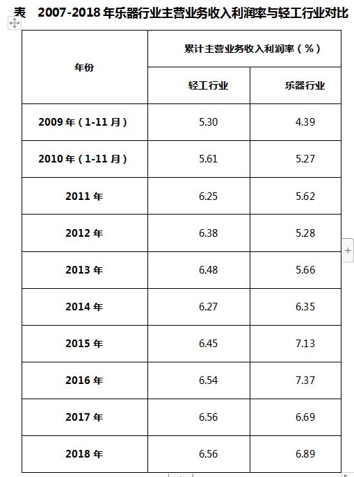 2018年,全国乐器行业累计主营业务收入利润率为6.89%,同比增长0.55%(由于统计局在统计口径方面有所调整,2018年利润率较去年的数据有所下滑,但按照当年的统计口径,利润率有小幅提升);高于同期全国轻工行业6.56%的平均水平。