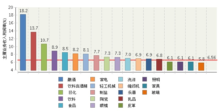 图13 2018年全国轻工全行业累计主营业务收入利润率重点行业对比