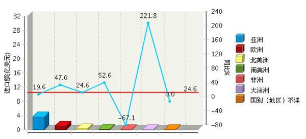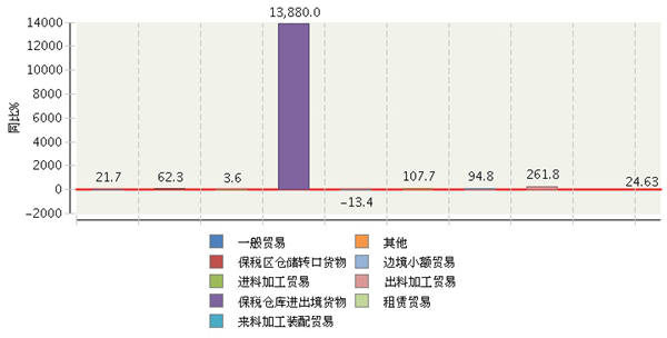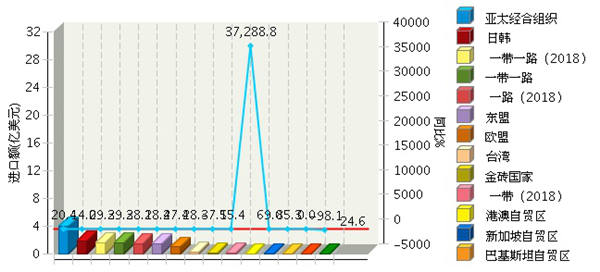 从各大洲贸易分析,亚洲占比居首位,累计进出口总额8.11亿美元(占38.3%),同比增长11.66%;主要经济组织贸易中,一带一路国家进出口总额微增,累计进出口总额4.5亿美元(占21.27%),同比增长16.41%,欧盟完成累计5.04亿美元(占23.81%),同比增长19.96%,增长较快。