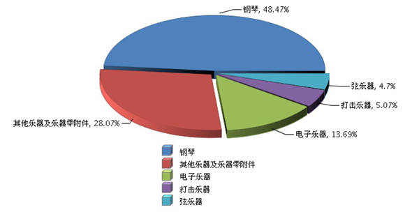 2018年,进口的乐器产品中,钢琴进口额占比接近一半,累计进口额2.37亿美元(占48.47%),同比增长20.29%;电子乐器完成累计进口额0.67亿美元(占13.69%),同比增长43.58%;打击乐器完成累计进口额0.25亿美元(占5.07%),同比增长25.36%;弦乐器完成累计进口额0.23亿美元(占4.7%),同比增长55.62%。