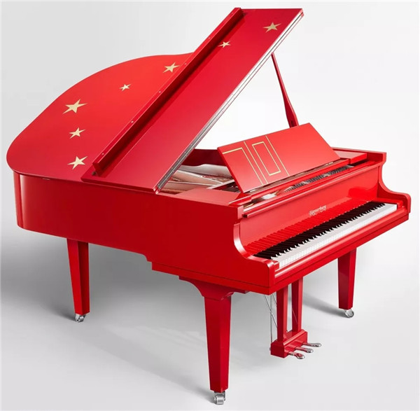 珠江•恺撒堡中国红钢琴是珠江钢琴集团为庆祝新中成立70周年特别定制的纪念款,琴身配置采用恺撒堡艺术家系列钢琴,整体外观设计简约现代。铁板选用流行的太空银色,令人耳目一新;谱架用精美的内藏金属线条,勾勒出“70”周年这一纪念版钢琴的特殊含义,与前后顶盖设计的7颗星星遥相呼应、相得益彰。配上亮丽而不失稳重的中国红钢琴亮光漆面,琴身上的星星迎着光闪耀,和谱架上的“70”概念图样一同将70年的风雨化为一首动人的赞歌。