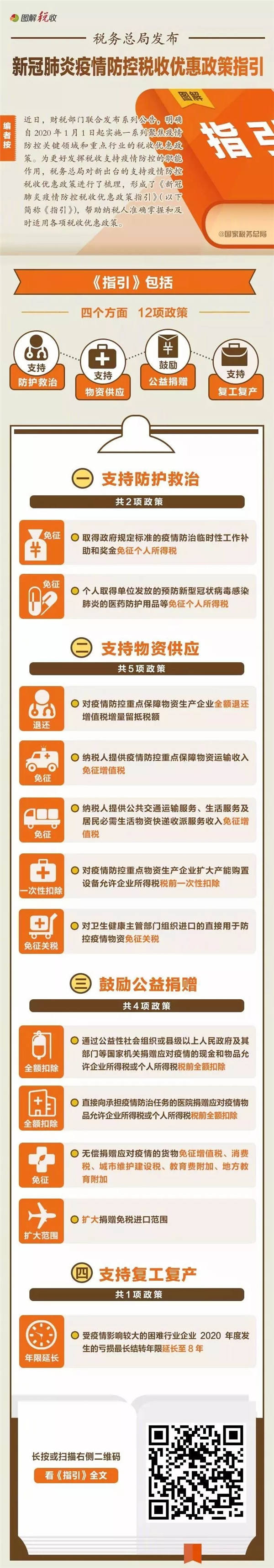 为更好发挥税收支持疫情防控的职能作用,税务总局对新出台的支持疫情防控税收优惠政策进行了梳理,形成了《新冠肺炎疫情防控税收优惠政策指引》,共涉及四个方面12项政策,助力打赢疫情防控阻击战。具体政策如下: