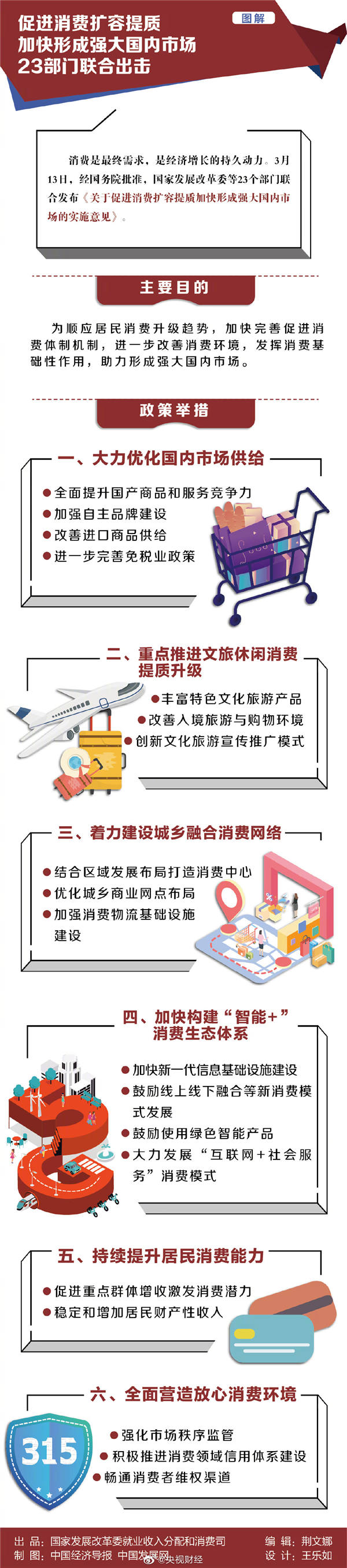日前,经国务院同意,国家发展改革委、中宣部、财政部、商务部等二十三个部门联合印发《关于促进消费扩容提质加快形成强大国内市场的实施意见》。《实施意见》提出,从市场供给、消费升级、消费网络、消费生态、消费能力、消费环境等六个方面促进消费扩容提质。详情如图: