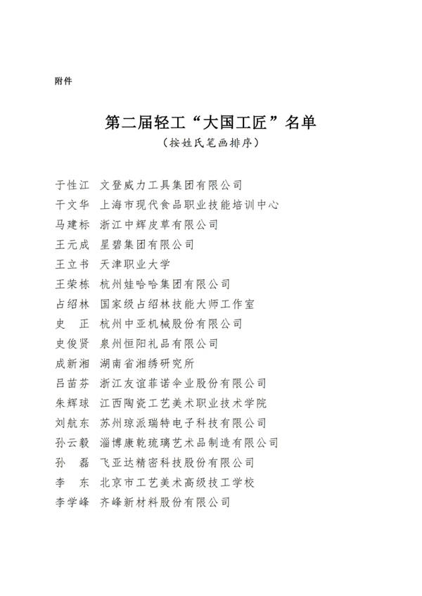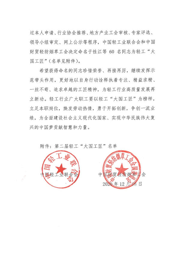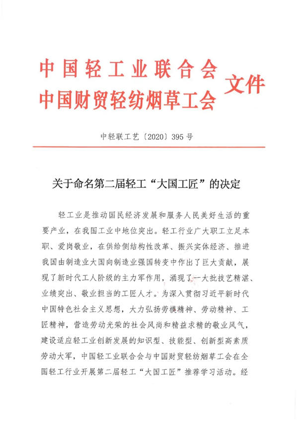 全行业要以轻工“大国工匠”为榜样,立足本职岗位,焕发劳动热情,勇于开拓创新,争创一流业绩,为全面建设社会主义现代化国家、实现中华民族伟大复兴的中国梦贡献智慧和力量。
