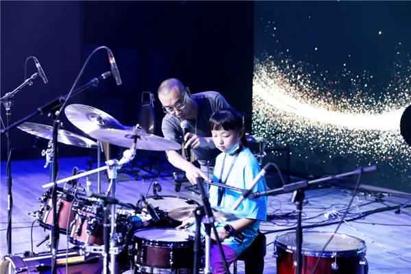 主舞台现场,在团体展演过来后,由讲演嘉宾——著名打击乐演奏家、鼓教师、NUX国际形象代言人张佳曦老师登台为大家带来了精彩的架子鼓show time!