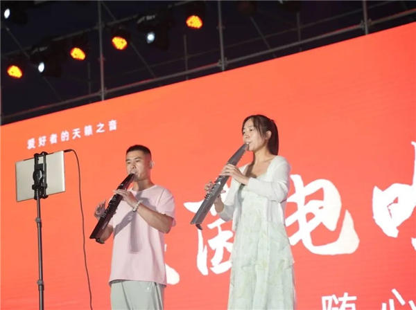 6月27日晚上,桐乡市屠甸镇汇丰村康馨文化园的大草坪上,一曲萨克斯开启“音乐之夜”,“力场——时尚艺术让乡村更美好”6.21国际乐器演奏日暨“美茵”电吹管发布会正式开启。富有节奏感的爵士乐引来现场观众阵阵掌声。“我家就住在屠甸,听朋友说康馨文化园很适合带孩子来玩,刚好他也想学个乐器,知道今晚有演出就带他来现场感受一下。”市民杨女士说。