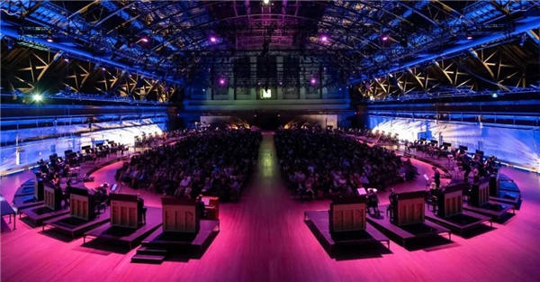 韦德・汤普森训练大厅开阔的空间特性,对声场均匀度与乐器共鸣表现提出极高要求。为让每一缕声波都精准传递,海伦技术团队提前进驻场地调试:通过专业设备测算空间声学参数,为50架钢琴逐一优化音板振动频率与击弦机响应速度;延续“每架琴高1/100音程”的核心调校逻辑,搭配升级后的Newzik智能化系统,确保11000根琴弦的振动完美同步。最终,声波在大厅中自然流淌,时而如引擎轰鸣,时而似狂风呼啸,精准还原哈斯“琴弦模拟宇宙声响”创作初心