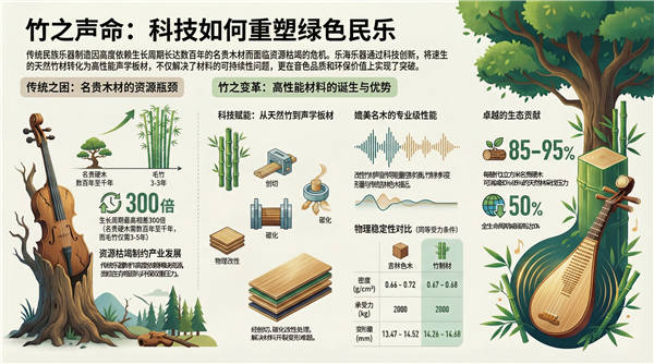 传统民族乐器面临的资源枯竭与实木生长周期长之间的矛盾,正成为制约产业规模化发展的核心痛点。根据乐海研发中心的数据对比,小叶紫檀、大红酸枝等名贵硬木成材需300甚至800年,而毛竹成材仅需3-5年。在相同的生产规模下,竹材的资源供给效率比传统硬木提升了20-160倍。 与此同时,合成材料虽在一定程度上缓解了资源压力,但在声学质感与文化认同度上仍难以完全替代自然材质。