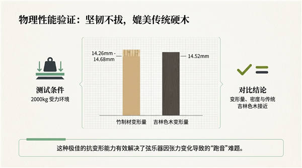 · 物理改性与复合压制:处理后的竹纤维通过专用环保胶合剂压制成型。受力测试显示,在 2000kg 受力环境下,竹制材的变形量(下垂度 14.26mm - 14.68mm)与传统吉林色木接近。这种极佳的抗变形能力直接提升了弦张力的稳定性,有效解决了律学上的“跑音”难题。