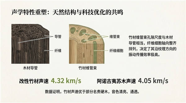 声学特性的优化与重塑。在最后的斫琴环节,竹板材与其他功能材料进行科学复合。专家研判认为,竹材维管束孔隙尺度与木材导管相当,其纤维细胞轴向整齐排列的特性,决定了其沿纹理方向的振动传播效率极高。