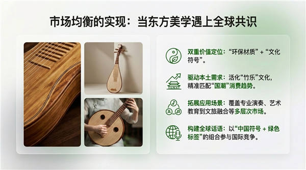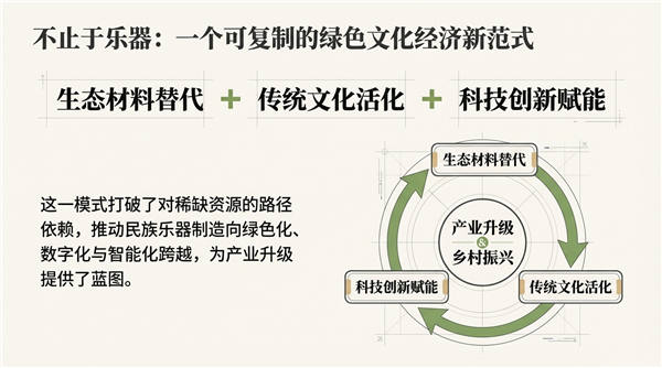 在产业升级的范式中,乐海乐器提供了一个“生态材料替代+传统文化活化+科技创新赋能”的可参考蓝图 。这种转型推动了民族乐器制造工艺向绿色化、数字化与智能化跨越,打破了以往对稀缺木材的路径依赖 。以替代1立方米名贵硬木计,竹制乐器不仅避免了对百年甚至千年古树的采伐,其对森林资源的综合保护贡献值在全生命周期视角下可达90-110%(含碳汇与水土保持价值) 。 通过构建从原料林到精密制造的全链条价值体系,企业正在实现从“中国制造”向“中国创造”以及“中国品牌”的跨越 。