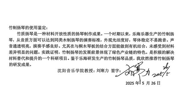 从文化叙事的角度看,竹作为中国传统礼乐文化的核心载体,承载着数千年的审美积淀。乐海通过材料活化,将“竹乐”这一古老的文化符号与现代工业设计相结合,使乐器不仅是发声的工具,更成为东方美学的传播媒介。沈阳音乐学院教授、著名扬琴演奏家刘寒力在试奏鉴定后指出:“竹质扬琴音质通透明亮,完全达到同类木制扬琴演奏标准,且解决了竹材与琴板结合的工艺难题。” 这种权威认可与文化赋能,不仅满足了当下“国潮”兴起的文化消费需求,更提升了中国民族乐器的国际文化价值。