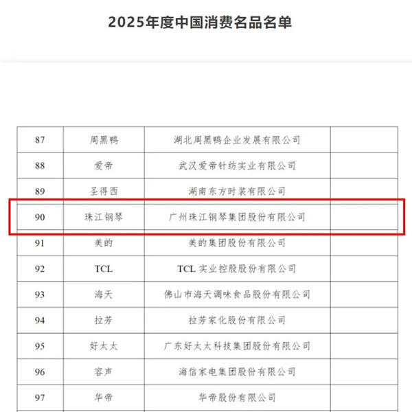 根据《工业和信息化部办公厅关于组织征集2025年度中国消费名品的通知》,经企业申报、省级工业和信息化主管部门初审推荐、专家评审,并征求国家发展改革委、民政部、生态环境部、商务部、应急管理部、市场监管总局、国家知识产权局、国家药监局、全国妇联、中国残联、全国工商联、中国消费者协会等单位及有关行业协会意见,2025年度中国消费名品名单于日前正式公示。在乐器行业领域,“珠江钢琴”成功入选该名单。(信息来源:中国消费品公众号)