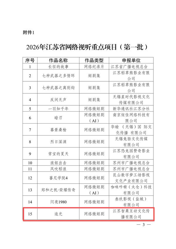 近日,江苏省广播电视局公布了2026年第一批江苏省网络视听重点项目名单,其中,由上海国光口琴厂有限公司投资出品、江苏智果互动文化传播有限公司拍摄制作的爱国主义教育电影(网络微短剧)《追光》成功上榜。