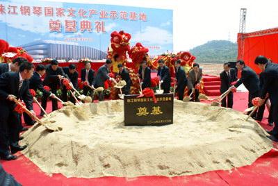 中国乐器协会网讯:3月27日,全球最大的钢琴制造商、国内钢琴行业龙头企业——广州珠江钢琴集团股份有限公司在广州增城经济技术开发区举行了隆重的珠江钢琴国家文化产业示范基地奠基典礼。广州市副市长、增城市委书记曹鉴燎,广州市国资委主任黄伟林,增城市市长叶牛平,增城市常务副市长彭高峰,增城经济技术开发区管委会副主任刘棕会,市国资委纪委书记陈海如,市发改委副主任陈浩钿,市财政局副局长吴国伟,市质监局副局长吴辉文,市金融办副主任陈平,增城市人大主任 王建平,增城市政协主席何鎏辉等各界领导嘉宾,以及珠江钢琴领导班子成员王润培、李建宁、曾郴湘、麦俊桦、麦燕玉、梁志伟、肖巍等出席了仪式,广州市国资委黄伟林主任、增城市叶牛平市长分别致辞,之后,曹鉴燎市长、黄伟林主任、叶牛平市长与相关市直部门领导、增城市及增城经济技术开发区相关领导、珠江钢琴主要负责人及施工单位广建集团主要负责人共同挥铲为基地奠基。