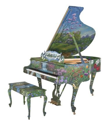 掀开琴盖,支起谱架,眼前的画面发生了魔术般的改变——池塘消失了,取而代之的是一片静谧湖泊。奇妙的是,湖泊的隘口完美地衔接到键盘盖上,成为另一个瀑布源头。湖水顺着键盘盖奔流而下,流向琴凳。顶盖板内深藏着另一处风景,这是一处仿若17世纪荷兰风景画的幽静山谷。湛蓝天底下,玉兰花和紫丁香向着天空翩然起舞,顶盖支架从上到下都涂上了与背面风景融为一体的色彩。如此一个由远、中、近景结合而成的立体景观,或许是任何绘画作品都难以形成的魔术效果。