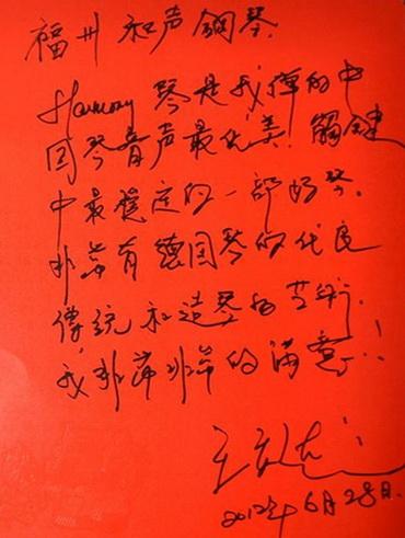 王立达教授对和声公司坚持“精品钢琴”的路线表示肯定和赞赏,对“哈曼尼”钢琴优美的声学品质和灵敏舒适的演奏性能赞不绝口,并为福州和声钢琴题词——HARMONY(哈曼尼)钢琴是我弹的中国琴音声最优美,触键最稳定的一部好琴,非常有德国琴的优良传统和造琴的艺术。我非常非常的满意!