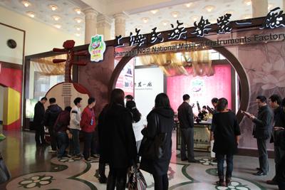“敦煌”展位布置典雅别致,以纱幕和翠竹为主要装饰元素,处处透出“江南丝竹”的韵味。最吸人眼球的便是矗立在门口的巨型乐器——雪梅月琴,此款乐器高4.20米、重450千克、共鸣体直径2.15米,给人以强烈的视觉冲击;其形如“月缺”,被雪花、梅花萦绕周身,亦给人以沁人心脾的和谐美感。参观者都争先恐后与她合影留念。同样受欢迎的还有集观赏价值与收藏价值于一体的微型乐器,其精湛的纯手工工艺及精致小巧的外形吸引了大量参观者在其橱窗前驻足、询问。上海民族乐器一厂还带来了富有文化内涵的“典藏版”精品乐器。以唐代诗人白居易的诗歌《琵琶行》为设计、装饰主题的紫檀木象牙雕刻琵琶; “古筝制作大师徐振高八十华诞”精品纪念版古筝、“世博”琵琶、“奥运”二胡及“大唐遗韵”系列的五弦、笙竽、排箫等极具文化底蕴和时代气息的特色乐器。