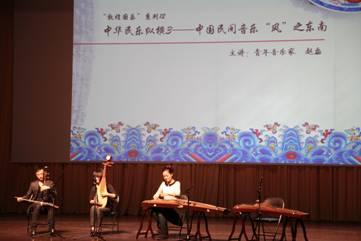 中国乐器协会网讯:4月14日,“敦煌国乐”系列讲座——“中国民间音乐‘风’之东南”在上海城市剧院举行。现场观众在青年二胡演奏家赵磊的带领下,以江南丝竹为起点开启东南行,聆听舟山锣鼓,再赏潮州音乐,倾听广东音乐,终觅福建南音,一路吹拉弹唱,十分热闹。中国东南地区的传统民族音乐风格以江苏、浙江、广东、福建等地方音乐为代表,乐风清新流畅、抒情柔美,旋律表述委婉、细腻、丰富,展现了中国东南部秀美、内敛、细致悠扬的浓情之美。为了让现场观众更深刻地体会到东南民间音乐的风格,主办方特别邀请了青年琵琶演奏家戴岚和青年古筝演奏家陆莎莎,为现场观众演奏了江南丝竹传统八大曲之一琵琶曲《三六》、潮州筝曲《粉红莲》,以及《步步高》《春江花月夜》《高山流水》等脍炙人口的民乐名曲。期间,赵磊玩性即起,用高胡为动画片《三个和尚》配乐,幽默的音调让听众重温童年记忆,笑声不断。中国民间音乐内容丰富,风格多样,一个半小时的讲座只能点到为止,让观众意犹未尽。