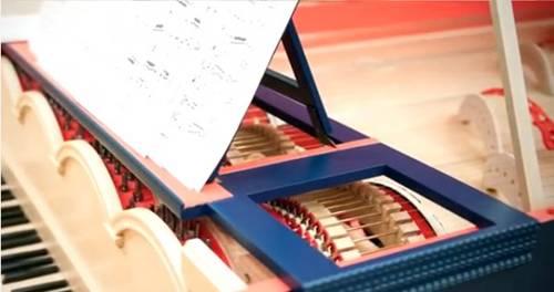 现在,在波兰音乐家Slawomir Zubrzycki的努力下,这个500年前的想法终于变成了现实。他花了5000小时实行这个项目,忠实再现了达•芬奇的概念,键盘通过钢弦拨动包裹着马毛的转轮。
