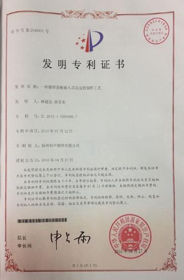 中国乐器协会网讯:近日,由福州和声钢琴有限公司自主研发的“一种钢琴嵌入式花边制作工艺” (专利号:201310293449.7)获得国家知识产权局授予的“发明专利证书”。