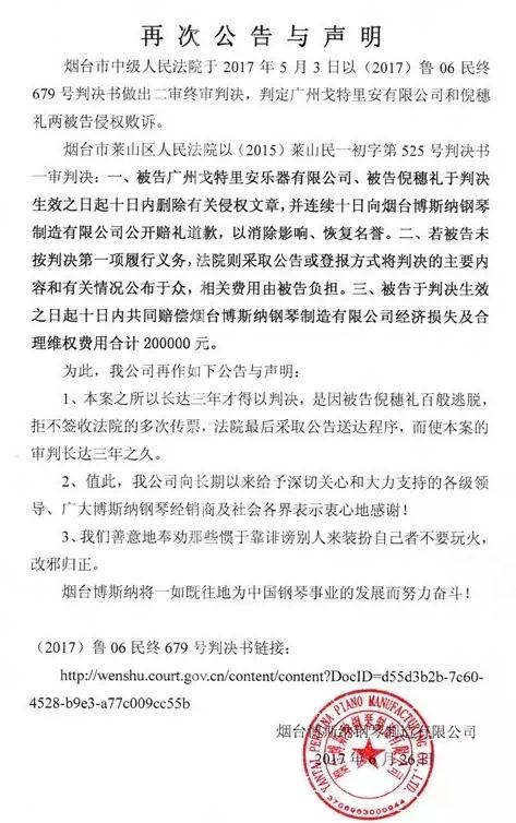 5 月3 日,烟台市中级人民法院(2017)鲁06 民终679 号判决书做出二审终审判决,判定广州戈特里安有限公司和倪穗礼两被告侵权败诉,维持一审判决。判决要求如下:一、被告广州戈特里安乐器有限公司、被告倪穗礼于判决生效之日起十日内删除有关侵权文章,并连续十日向烟台博斯纳钢琴制造有限公司公开赔礼道歉,以消除影响、恢复名誉;二、若被告未按判决第一项履行义务,法院则采取公告或登报方式将判决主要内容和有关情况公布于众,相关费用由被告负担;三、被告于判决生效之日起十日内共同赔偿烟台博斯纳钢琴制造有限公司经济损失及合理维权费用合计200000 元。烟台博斯纳钢琴表示,本案之所以长达三年才得以判决,系因被告倪穗礼拒不签收法院多次传票,致使法院最后采取公告送达程序。烟台博斯纳钢琴向长期以来给予深切关心和大力支持的各级领导、广大博斯纳钢琴经销商及社会各界表示衷心地感谢!同时善意奉劝惯于靠诽谤他人者改邪归正,行业同仁共同营造健康良性的市场环境和竞争机制。(博斯纳钢琴)