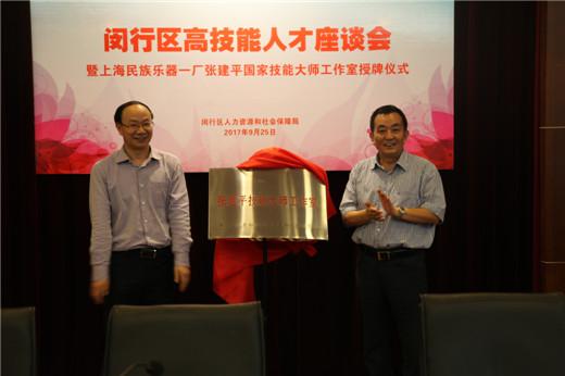 2017年9月25日,闵行区高技能人才座谈会暨张建平国家技能大师工作室授牌仪式在上海民族乐器一厂举办。闵行区区委常委、副区长曹扶生,闵行区人社局局长龚惠斌,闵行区各街镇分管领导及高技能人才代表等60余人出席了本次会议。与会人员在上海民族乐器一厂厂长王国振、书记孙云的陪同下参观了生产车间、张建平技能大师工作室以及民族乐器陈列馆,欣赏了由上海馨忆民族室内乐团带来的民乐演奏。