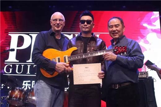 Paul Reed Smith先生(左)和雅登音响乐器(上海)有限公司董事长Henry K.S. Lee先生(右),联合为李延亮颁发PRS电吉他。