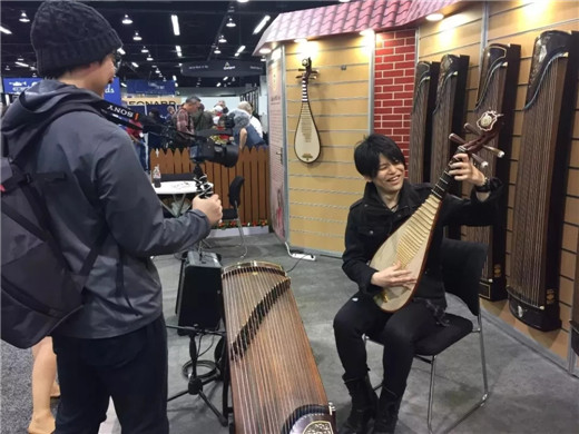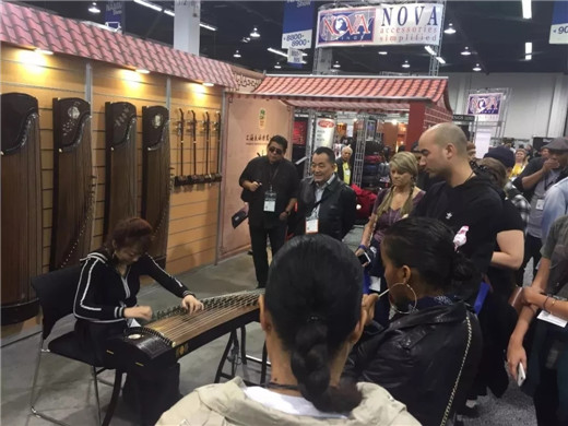 除了与巴德美中音乐研习院的合作外,上海民族乐器一厂于1月25日—1月28日参加了在美国阿纳海姆会展中心举办的第118届美国阿纳海姆国际乐器展。此次展位的设计以老上海为主题,红砖墙与暗红色瓦片屋顶遥相呼应,原木色的槽板上整齐悬挂了“敦煌牌”古筝、琵琶、二胡等民族乐器,营造出了浓厚的中国氛围。中国乐器协会秘书长陈晋武特地参观了上海民族乐器一厂的展位,并与工作人员进行了亲切交谈。