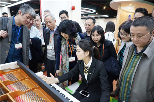 在艾茉森的音乐展厅里,中国音乐金钟奖金奖最年轻的获得者刘云天用“恺撒堡·幻彩”智能钢琴为大家演奏了两首曲子,一首温柔婉转一首激昂澎湃,赢得了现场的热烈掌声。工作人员也为大家做了现场演示,在连接互联网后,配合"恺撒堡·幻彩"内置的教学系统,根据自身情况自由安排练习课程,还可以回顾教学视频、跟录音练习合奏。高端钢琴的弹奏体验遇上丰富趣味的智能系统,给参访团成员们带来了前所未有的体验。