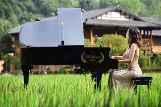 随着《浏阳河》、《在希望的田野上》、《欢乐颂》等大家熟悉的旋律响起,时而磅礴气势、时而温婉轻柔,博兰斯勒的黄金音色响彻仙境般的山川田野之中,余音袅袅,久久回荡……118架钢琴发出的悦耳琴声,伴随着美丽的苗族姑娘的翩翩身姿,在希望的田野上奏响同一个美好愿望,为黄龙点睛!