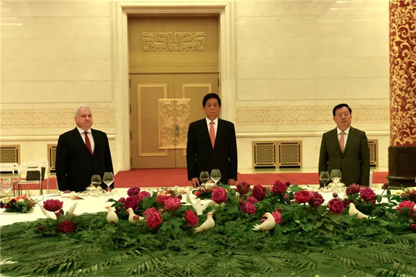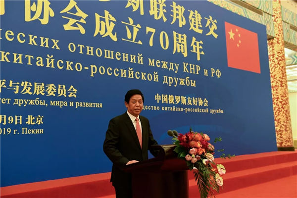 在中俄建交70周年,中俄进入新时代全面战略协作伙伴关系的历史时期,中国人民对外友好协会,中俄友好、和平与发展委员会,中国俄罗斯友好协会于10月9日晚在人民大会堂金色大厅举行庆祝中华人民共和国与俄罗斯联邦建交暨中国俄罗斯友好协会成立70周年招待会。中共中央政治局常委、全国人大常委会委员长栗战书,俄罗斯驻华大使杰尼索夫出席并致辞。