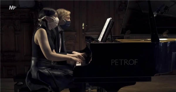 这或许是钢琴家Ivo Kahánek第一次在自己的音乐会上戴口罩演奏,或许也是钢琴家Ivo Kahánek第一次在没有观众的舞台弹奏佩卓夫钢琴。虽然偌大的场地只有钢琴家一个人在静静弹奏,但屏幕前的我们却仍然能够感受到音乐的魅力与艺术带给我们的力量。除了钢琴家Ivo Kahánek带来的精彩钢琴独奏,他还与特邀而来的女钢琴家Jarmila Holcová一起四手联弹合奏了捷克作曲家德沃夏克的经典曲目。两位钢琴家所佩戴的一黑一白口罩和钢琴黑白键遥相呼应,显示出两位艺术家用音乐助力抗疫的决心。两位钢琴家演奏了贝多芬,德沃夏克等著名音乐家的经典作品。钢琴家精湛的琴技与佩卓夫钢琴的浪漫琴音相配合,为屏幕前的观众营造了一场别具风格的线上音乐会。