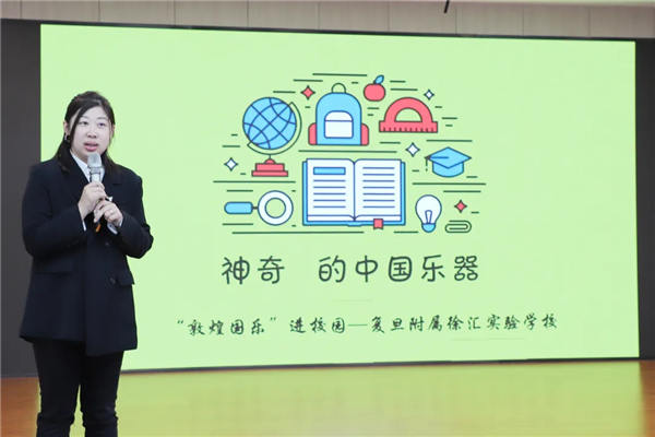 活动开始,上海民族乐器一厂旗下敦煌艺术学校副校长宋蕾女士向学生们介绍了中国乐器的主要材料来源、并以人声为例讲解了乐器的震动发声原理。