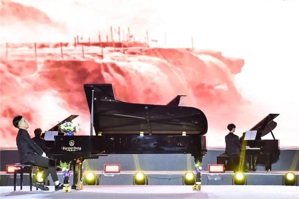 又是一阵掌声过来,迎来当晚最精彩的演出,那就是职工钢琴演奏师用30台珠江·恺撒堡钢琴,在精彩的灯光氛围中演奏《保卫黄河》,恢弘的琴音与活动的灯光秀一起点亮整个夜空。