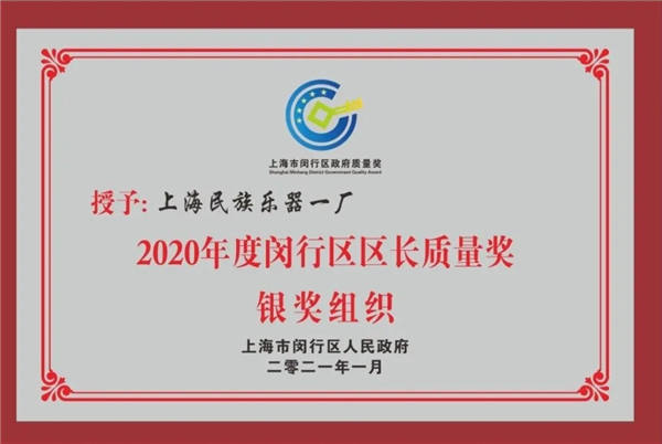 2021年8月3日,闵行区举办2020年度区政府质量奖颁奖仪式,表彰为推广卓越绩效管理模式的先进组织及个人,会议于闵行区政府举行,区委副书记、区长陈宇剑,区委常委、副区长管小军等领导出席会议。上海民族乐器一厂有限公司荣获“2020年度闵行区区长质量奖银奖组织”殊荣。