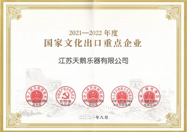 日前,商务部、中宣部、财政部、文化和旅游部、广电总局五部委共同认定江苏天鹅乐器有限公司为2021-2022年度“国家文化出口重点企业”。此次评定旨在鼓励和支持我国文化企业参与国际竞争,扩大文化产品和服务出口,促进“一带一路”国际合作,从而推动对外文化贸易高质量发展。