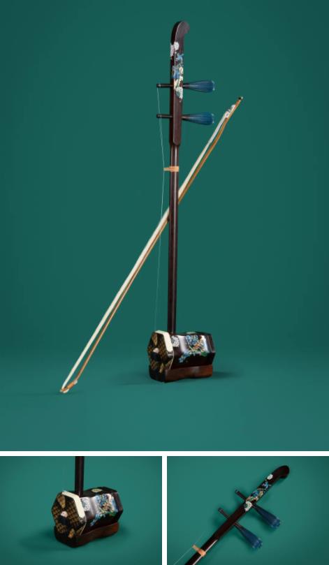 东情西韵二胡以梵高的《鸢尾》和清代恽寿平《花卉图册》作为设计元素,梵高的绚烂明艳,张扬热烈,遇上恽寿平没骨画法的清丽婉约,含蓄内敛,以传统的漆画工艺重新表达,深与浅,明与暗,不同色彩的涂抹,营造出丰富的视觉层次,演绎出独特的东情西韵。