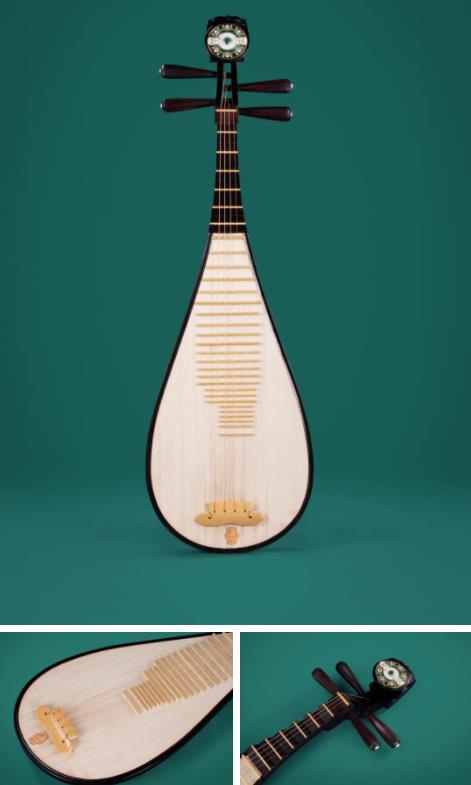 在此次进博会上,“敦煌牌”金玉良缘琵琶也首次出现在大众视野。金玉良缘琵琶以大都会艺术博物馆藏的“带有赫拉克勒斯结的金臂环”和上海博物馆“嵌宝八角玉盘”作为元素灵感,结合琵琶古雅的外形,共谱一曲金玉良缘。其工艺装饰部分采用金银镶嵌工艺,精雕细刻,造型典雅而精致,别具美感。