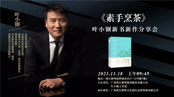 在叶小钢工作室正式揭幕的当天,同场将举行由珠江钢琴集团与叶小钢工作室联合主办、广州珠江钢琴文化园区运营管理有限公司承办的“《素手烹茶》叶小钢新书新作分享会”,内容包括作者访谈和新书签发。