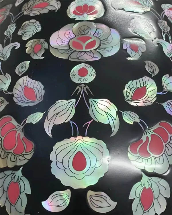 这款琵琶为非洲紫檀木质,背面饰有螺钿之鸟蝶,花卉云形及宝相花纹,花心叶心间,涂以红碧粉彩,显现彩文之美,极为瑰丽工巧。在琴体正面装饰六瓣花形,琴轴等处作菱形状纹样,使琴面和谐统一。该款琵琶质地华贵,装饰精美,色彩富丽,反映了唐文化的异彩纷呈。