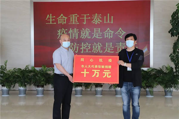 5月4日,张敏委托江苏奇美乐器有限公司办公室主任吴燕国,给城南办事处送去10万元爱心捐款,郑重委托城南办事处将款项捐到城南抗疫一线。城南办事处人大工委主任朱忠武接过爱心捐款,说:“非常感谢人大代表张敏在靖江抗疫关键时期的热心援助,我们将继续激励斗志、鼓舞士气,奋力打赢这场疫情防控阻击战。”(靖江市融媒体中心)