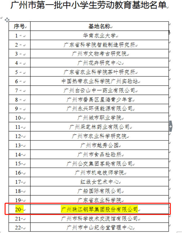 近日,珠江钢琴集团获广州市教育局评定为“广州市第一批中小学生劳动教育基地”。